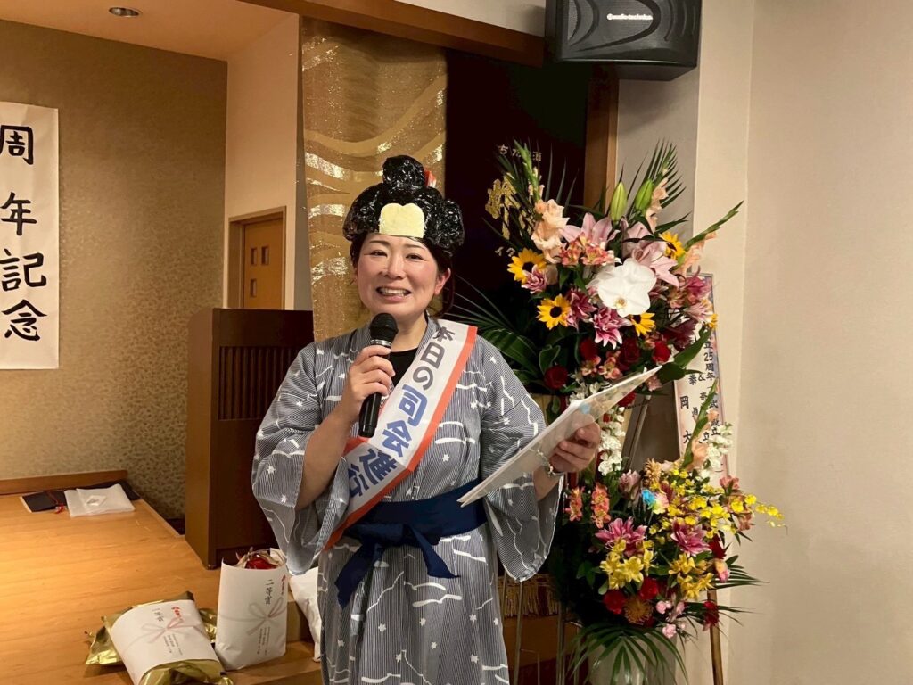 そしてまたこちらもノリの良い立志会代表師範の瀬戸口利秋先生に黄色のでっかい蝶ネクタイで乾杯の音頭を。