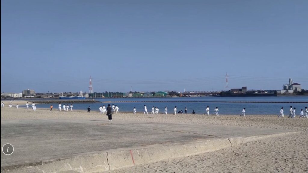 ランニング後は砂浜でその場基本と形。